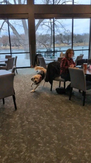 Stuffy was born on June 22,2023. He is a pure-bred English Cream Golden Retriever. His nickname "Stuffy" was given to him by his puppy raiser, because he looked remarkably like a stuffed animal when he was little. He was sponsored by MoJo Consultants and they named him "Eric" - Patriot Paws was sensitive to the needs of CornerHouse and agreed that the name "Stuffy" was better suited for his work with children. He followed the same training path as any typical service dog: How We Train - Patriot PAWS Service Dogs